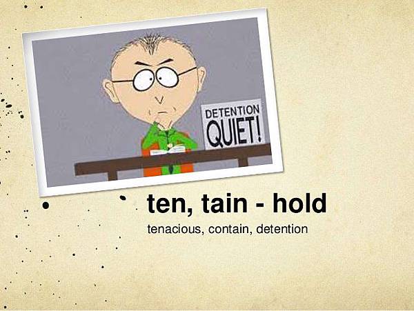 ten / ious = hold / adj. = holding tightly onto sth. 緊握的 (如果緊握著一個意見,也可以引申為堅決的) She’s an extremely tenacious entrepreneur. 她是個非常有韌性的企業家。